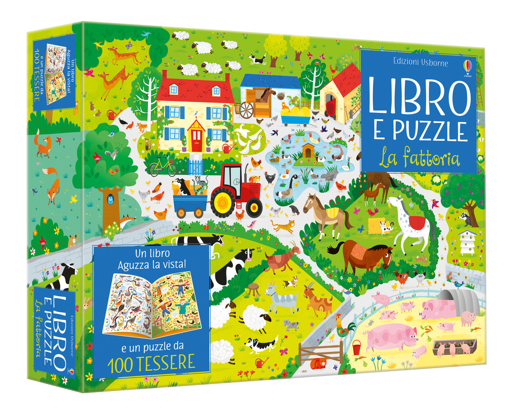 una confezione con un puzzle da 100 tessere per creare una vivace scenetta e un libro pieno di particolari da individuare e osservare, entrambi ambientati in una coloratissima fattoria. Perfetto per stimolare la capacità di osservazione e la manualità dei più piccini. Età di lettura: da 3 anni.