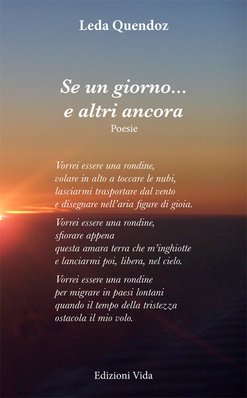 Vorrei essere una rondine, volare in alto a toccare le nubi, lasciarmi trasportare dal vento e disegnare nell'aria figure di gioia. Vorrei essere una rondine, sfiorare appena questa amara terra che m'inghiotte e lanciarmi poi, libera, nel cielo. Vorrei essere una rondine per migrare in paesi lontani quando il tempo della tristezza ostacola il mio volo.